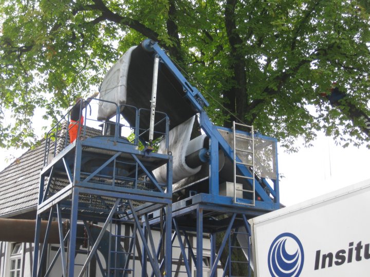 Der erste Einbauabschnitt sah die Inversion gegen, der zweite in Fließrichtung vor. Die Herausforderung bestand neben den Dimensionswechseln und der Durchfahrung der vielen Bögen mit bis zu 45° insbesondere auch in der Festlegung der Höhe der Wassersäule. Hier waren die Insituform-internen Vorgaben gemäß dem Qualitätsmanagement zu beachten und gleichzeitig die geringe Überdeckung des Altkanals von teilweise nur 50cm. Ein zu hoher Innendruck könnte schnell zur unerwünschten Aufweitung des Altrohres und folglich der Straßenoberfläche führen, da die Auflast zu gering wäre: Die Höhe des Gerüstturms (mit ausgeklapptem Förderband) betrug daher 7,70m.