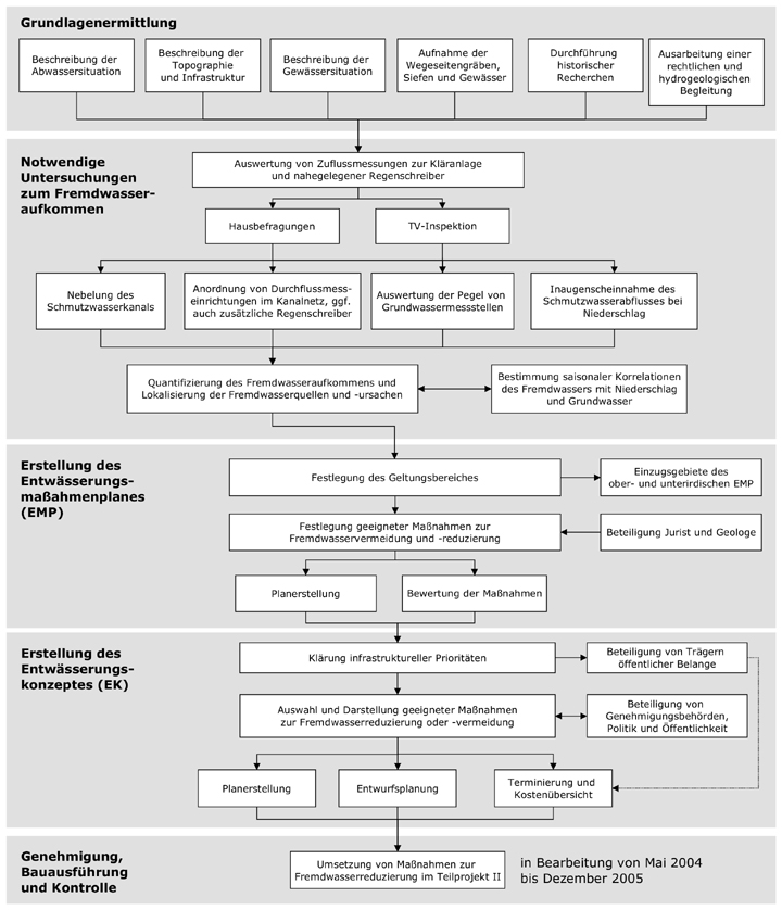 Im Entwässerungskonzept (EK) werden auf Basis des EMP technisch sinnvolle Maßnahmen zur Reduzierung und zukünftigen Vermeidung von Fremdwasser festgelegt. Auf die genehmigungsrechtliche und politische Durchsetzbarkeit der ausgewählten Maßnahmen ist besonderer Wert zu legen. Nach einer Ausarbeitung mit Entwurfsgenauigkeit werden die Baumaßnahmen in einen zeitlichen und finanziellen Rahmen gesetzt.