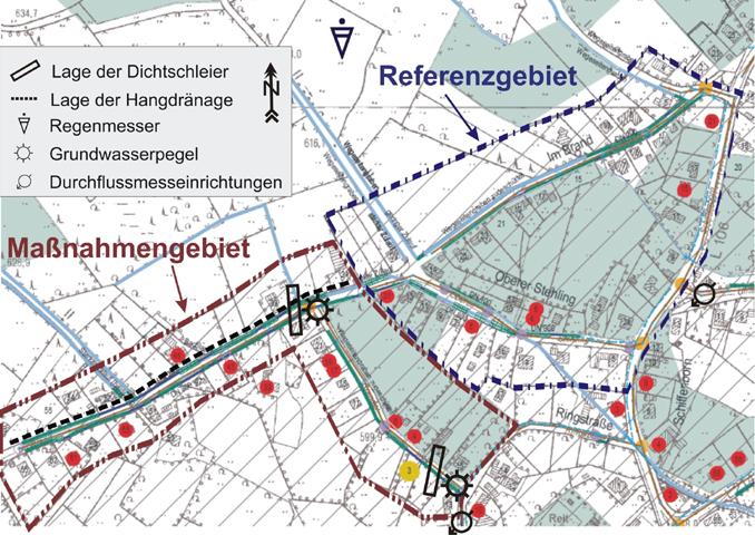 Ziel des im Frühjahr 2004 begonnenen zweiten Teilprojektes ist die exemplarische Umsetzung der im Entwässerungskonzept des ersten Teilprojektes vorgeschlagenen Maßnahmen. Hierfür wurden im Ortsteil Mützenich zwei benachbarte entwässerungstechnisch ähnliche Gebiete ausgewählt (siehe Bild 2). Im "Maßnahmengebiet" werden die Maßnahmen baulich umgesetzt, das "Referenzgebiet" dient zur Kontrolle der Leistungsfähigkeit der Fremdwasserreduzierung. Die Grundstücke entwässern über einen Schmutzwasserkanal und Wegeseitengräben. Die Reaktivierung der Wegeseitengräben, die Inspektion und ggf. Sanierung privater Leitungen sowie das Abkoppeln von Dränagen erfolgt im gesamten Maßnahmengebiet. Die Lage der Dichtschleier ist eingezeichnet.