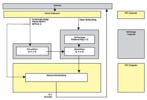 - zentrales Steuerungssystem zur Ermittlung der Soll-Werte, basierend auf gemessenen und prognostizierten Messwerten einschlieslich Online-Niederschlags- und -Abflussvorhersage.