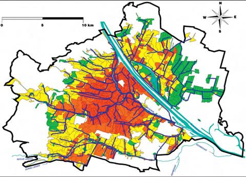 Das Wiener Kanalnetz umfasst insgesamt ca. 55 000 Haltungen. Zur Reduzierung der Rechenzeit insbesondere für die Entwicklung der Steuerungsregeln und für die Online-Simulation wurde ein Grobnetz, bestehend aus ca. 2 500 Haltungen entwickelt (Abbildung 4). Die abflusswirksamen Flächen wurden aus Infrarot- Luftbildern digitalisiert. Das Hystem-Extran-Modell des Feinnetzes wie auch des Grobnetzes wurde anhand von Niederschlag- Abfluss-Messungen kalibriert.