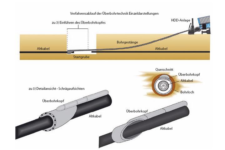 Defekte, freigeschaltete Altkabel werden an zwei Stellen in Baugruben getrennt und jeweils ein Stück herausgeschnitten. Auf der HDD-Maschinenseite wird der am Bohrgestänge angeschraubte Überbohrkopf sehr flach und auf Überfahrhöhe zum Altkabel lageparallel über das Kabel gefahren. Danach wird das ca. 30 cm überfahrene Altkabel mittels Kabelschuh oder Ziehstrumpf und einer Seilverbindung zugfest mit der Halterung verbunden. Der Überbohrkopf wird danach unter links-rechts-schwenkenden Bewegungen über das Altkabel gefahren. Aufgrund dieser Schwenkbewegungen wird das besonders fest verbundene Bohrgestänge in einer Geschwindigkeit von ein bis zwei Meter pro Minute über das Altkabel gefahren. Der TT-Überbohrkopf ist so konstruiert, dass er auch einen schlängelnden Lageverlauf des Altkabels nachfahren kann. Das Altkabel bildet die Zwangsführung für den Überbohrkopf, der in gleichmäßigem Abstand um das Altkabel die anhaftende Sandbettung bzw. das anhaftende Erdreich in einem sehr schmalen Ringkranz freischneidet. Nach Überfahrung der abgetrennten Altkabelstrecke wird der Überbohrkopf vom Bohrgestänge abgeschraubt und ein Ziehstrumpf oder Kabelschuh für den Einzug des Neukabels vorbereitet. In der Zwischenzeit kann das freigebohrte Altkabel von der Startseite her mit einer Seilwinde oder einem Bagger gezogen werden. Exakt in den freigewordenen Altkabelverlauf kann mit dem im Bohrloch befindlichen Bohrgestänge nun das neue Kabel lagegleich eingezogen werden. Keinerlei Bestandspläne müssen hierfür neu eingemessen werden, lediglich das neue Kabel wird im Kartenwerk vermerkt. Sowohl die hohe Austauschgeschwindigkeit (ca. 120 m Kabelüberbohrung in ein bis zwei Stunden) als auch die Einsparung von Vermessungskosten machen das Verfahren besonders wirtschaftlich.