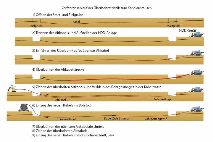 Grabenlose Leitungsaustauschverfahren gibt es seit vielen Jahren, vorwiegend für Hausanschlüsse und Netzleitungen. Bis auf das Berstverfahren und das Stahlrohraustreiben mit Erdraketen sind diese Verfahren allerdings mit einem hohen Zeit- und Kostenaufwand verbunden. Inzwischen wurden mit den von Tracto-Technik entwickelten Überbohrverfahren zum grabenlosen Austausch von Erdkabeln viele gute Erfahrungen gesammelt, die eine weitere Verbreitung dieser Technologie empfehlen lassen.