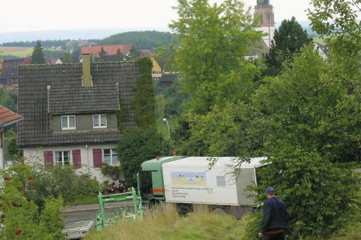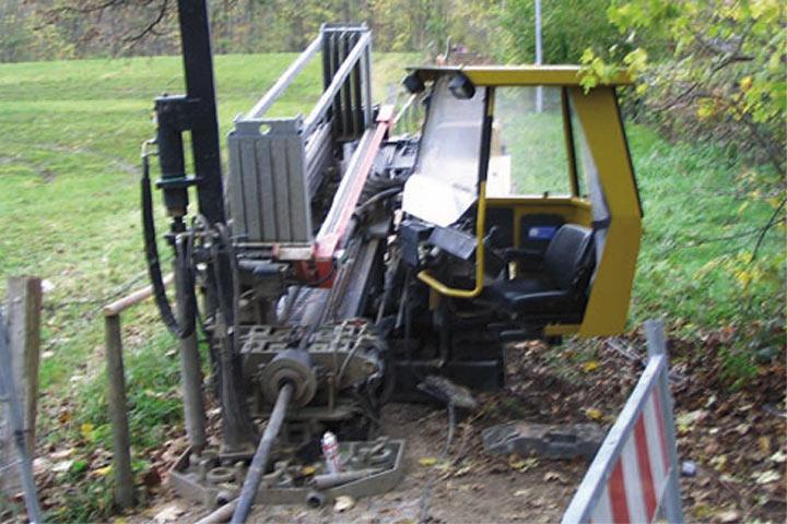 Die Baustellenfotos auf dieser Doppelseite zeigen Kabelaustauschanwendungen unter einem Fußgängerverbindungsweg in der Wohnsiedlung Buchhalde in Dettingen/ Erms im Landkreis Reutlingen. Hier mussten defekte 10 kV-Erdkabel aus den 1970er Jahren ausgetauscht werden. Dazu wurden Grundodrill 13 X-Bohranlagen eingesetzt, auf denen TT-Überbohrköpfe mit kurzen, gegenläufig gestellten, kantigen TCI-Schneidbits an der austauschbaren Frontscheibe und mit Innenabweisring zum Einsatz kamen. Die Austauschstrecke unter dem Treppenweg bei Dettingen/Erms umfasste 125 m.