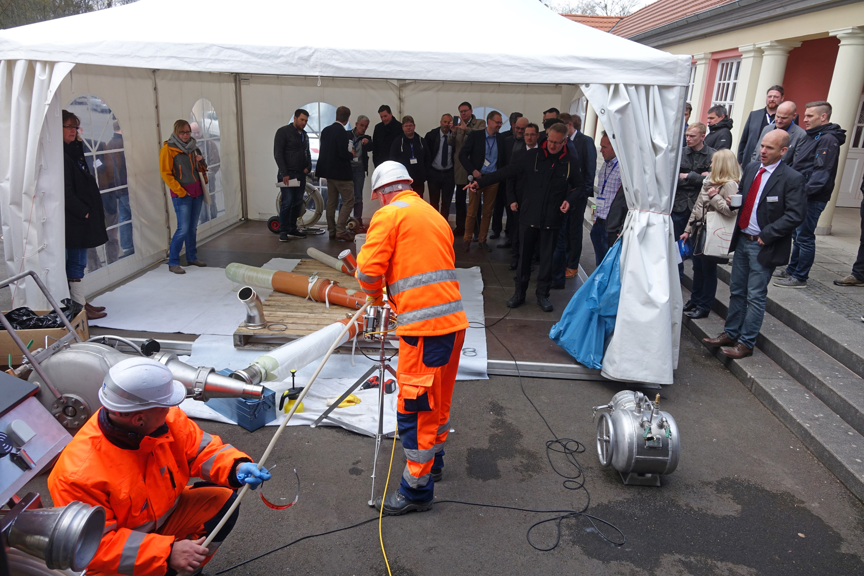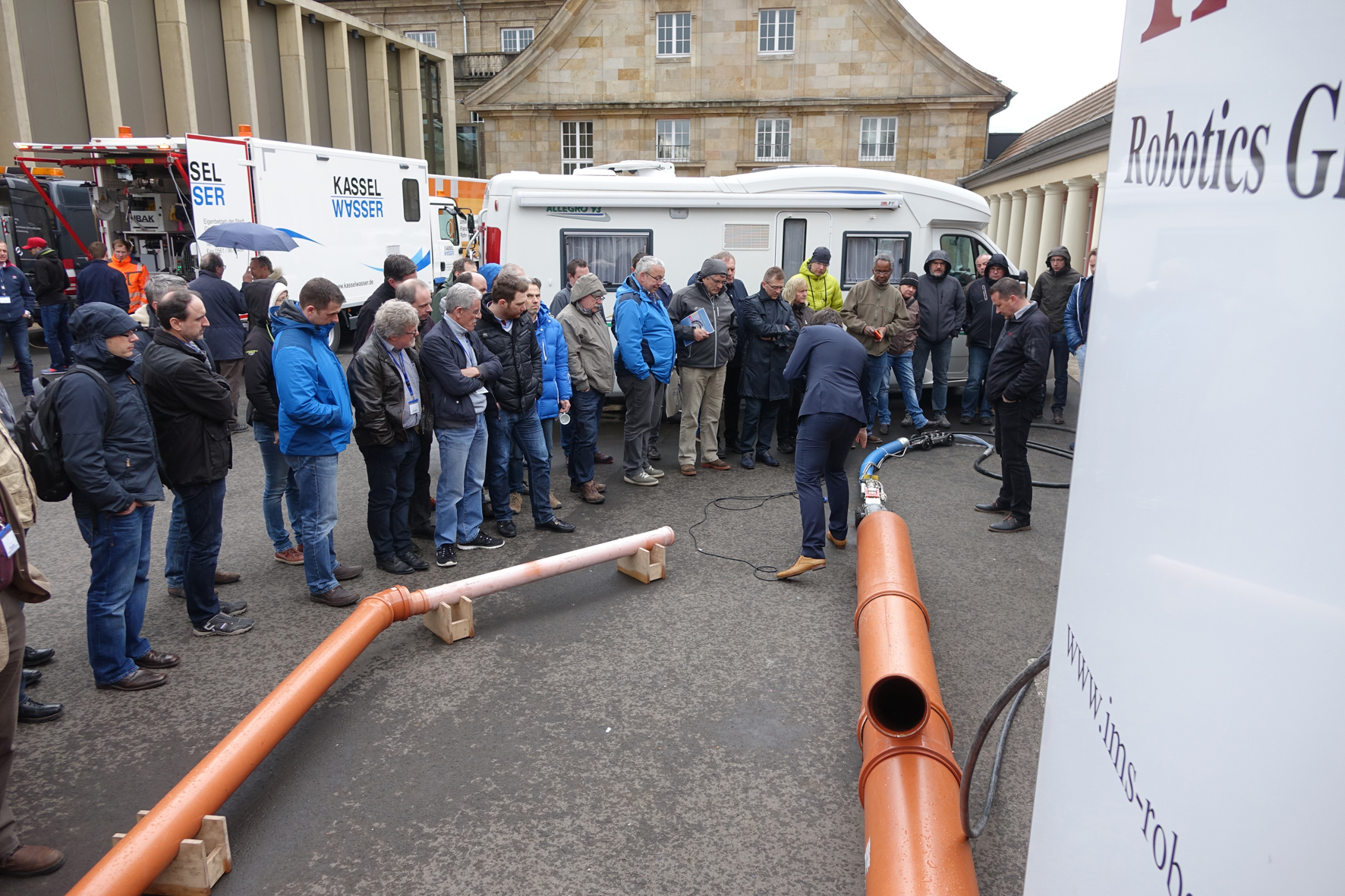 Bei den darauffolgenden Außenvorführungen konnten die Besucher die Anwendung moderner Repartaturverfahren live erleben. Etwa das Fräsen mit elektrischem Fräsroboter bei der IBAK Helmut Hunger GmbH & Co. KG, das Janßen-Light-Verfahren im Eiprofil bei der Umwelttechnik Franz Janßen GmbH oder eine Schachtsanierung mit dem Vertiliner-Verfahren bei der Rohrsanierung Jensen GmbH & Co. KG. Produkte der „vor-Ort-härtendenen Werkstoffe“ am Beispiel Kurzliner und Handlaminat stellte die Kuchem GmbH vor, um die Vorführung eines Satellitensystems ging es bei der IMS Robotics GmbH.
