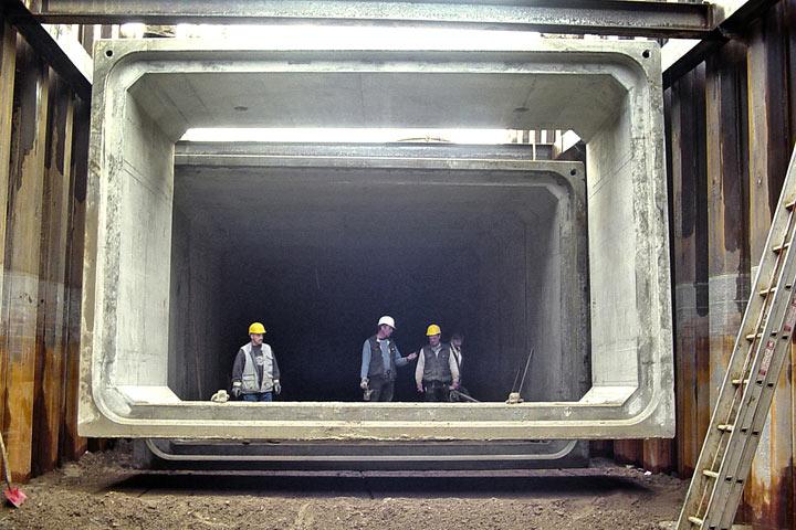 Zum Einsatz kamen 31 Stahlbetonprofile mit Rechteckquerschnitt. Die 5,75 m breiten und 3,70 m hohen Rechteckprofile sind 2,5 m lang und wiegen rund 44 t. Neben den großen Dimensionen ist ein bautechnisches Merkmal besonders erwähnenswert. Die Profile verfügen mit der so genannten aktivierbaren Dichtung über eine Technologie, die bei Westrohr entwickelt worden ist. "Die Idee der aktivierbaren Dichtung entstand aus den zum Teil leidvollen Erfahrungen mit der herkömmlichen Dichtungstechnologie", erläutert Dipl.-Ing. Erich Valtwies, Geschäftsführer Westrohr Betonwerk Münster GmbH & Co. KG.