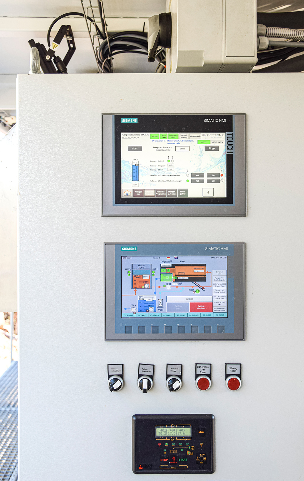 Um den sich verändernden Ansprüchen der Auftraggeber von vorneherein Rechnung zu tragen, wurde darüber hinaus als Zusatz eine Flockstation fest verbaut. Dies diente dem Ziel der angestrebten Komplettlösung, mit der Recyclinganlage die verbleibende Bohrspülung vollständig wiederaufzubereiten. Ebenso außergewöhnlich ist die Überwachung der Pufferbehälter, in diesem Fall die Tanks eines am Markt üblichen Misch-LKWs.