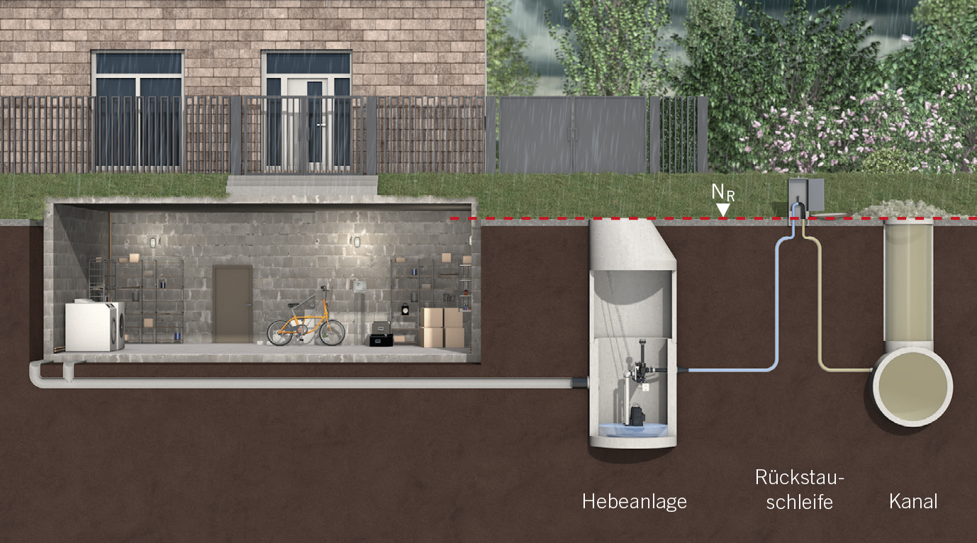 Doch trotz aller makrostrukturellen Anpassungen – dazu gehört auch die Sorge um eine leistungsfähige Kanalisation seitens ihres Betreibers – bleibt es unweigerlich im Verantwortungsbereich jedes einzelnen, Haus- und Grundbesitz vor Starkregenschäden zu bewahren. Schutz gegen Überflutung ist dabei die eine Seite, Rückstauschutz die andere. Um rückstaugefährdete Gebäudeteile und Grundstücksareale abzusichern, empfehlen die Autoren der maßgeblichen Normen DIN EN 12056-4 und DIN 1986-100 den Einbau einer Hebeanlage mit nachgeordneter Rückstauschleife.