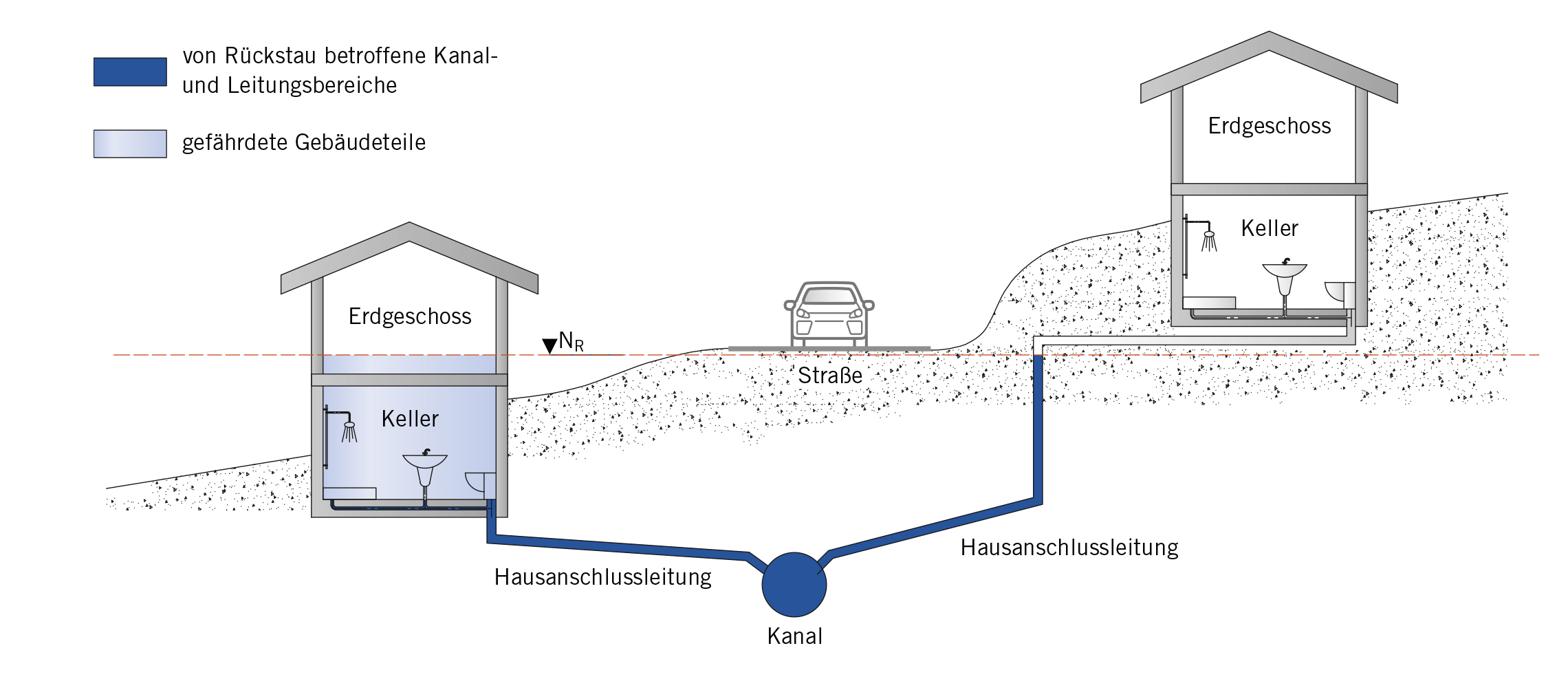 Die maßgebliche Frage ist, ob das Gelände längs der Straße abfällt oder quer zu ihr. Bei Quergefälle sind die zur Straße talwärts gelegenen Anwesen in ungleich höherem Maß rückstaugefährdet als jene, die hangaufwärts liegen. Unter Annahme einer Rückstauebene auf Straßenniveau sowie einer entsprechend starken Geländeneigung kann die Rückstaugefährdung in abwärts gelegenen Gebäuden bis ins Erdgeschoss reichen. Abhängig von Topografie und Bauweise liegt hingegen oberhalb der Straße vielleicht gar keine oder nur eine geringe Gefährdung vor.