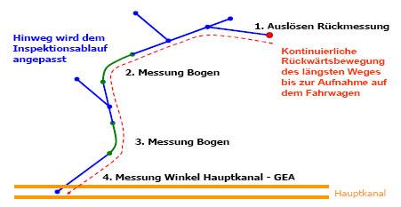 - Beim Abschluss der Untersuchung einer jeden Grundstücksentwässerung wird von dem am weitesten entfernten Punkt zum Anschluss bei der Rückwärtsfahrt eine Kontrollmessung zur Überprüfung der erhobenen Vermessungsdaten durchgeführt.
