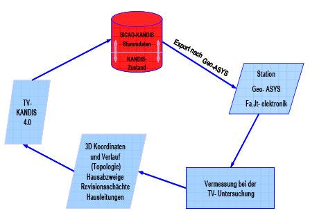 Hierzu schaute man sich am Markt um, welche vorhandenen Inspektionssysteme es gibt. Systeme die es ermöglichen bei der Inspektion, der nun zu untersuchenden Zuleitungskanäle, die geografische Lage mit ab zu bilden und schnittstellenkonform in das vorhandene Geoinformationssystem des Kasseler Entwässerungsbetriebes zu implizieren. Schnell wurde klar, dass, obwohl bei unterschiedlichsten Anbietern Grundlagen vorhanden waren, keines der Systeme für den Kasseler Entwässerungsbetrieb in Frage kam. Das System „ASYS“ der Firma JT-elektronik in Zusammenarbeit mit der Bundeswehruniversität München war zu diesem Zeitpunkt das Vielversprechenste. Nach mehreren Gesprächen zwischen den Akteuren (Firma JT-Elektronik, BW Uni München und dem KEB) wurde ein Public Private Partnership Projekt gegründet. Dieses Projekt hat die Zielsetzung das vorhandene System „ASYS“ in „Geo-ASYS“ (Unterirdische geodätische Anschlusskanalvermessung in Verbindung mit der TV-Inspektion zur automatisierten Weiterverarbeitung der Daten im Geoinformationssystem) zu transformieren. „Geo-ASYS“ soll in der Lage sein, den Verlauf des gerade zu untersuchenden Kanals in Echtzeit auf dem Inspektionsfahrzeug zur Unterstützung des Inspekteurs darzustellen. Die georeferenzierte Lage (x, y und z Koordinaten) des Kanals in seinen Detail (Leitung, Abzweig, Revisionsschacht) an ein Geoinformationssystem zu übergeben. Im GIS sollen nun alle Informationen (Zustand, Berichte, Bilder, Videos) verknüpft werden. Im GIS oder in einem darauf aufgesetzten Informationssystem sollen die Daten, wie auch schon die, der öffentlichen Kanäle, abrufbar sein.