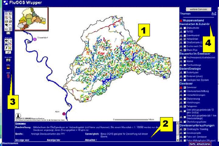 Dies erfordert neben einem effizienten internen Datenmanagement auch den Daten- und Informationsaustausch mit externen Körperschaften der Wasserwirtschaft. Es gilt, ein wasserwirtschaftliches Netzwerk zu organisieren. Der Wupperverband setzt zu diesem Zweck auf moderne Kommunikations- und Informationstechnologien und betreibt im Internet das digitale FlussGebietsGeoinformationsSystems FluGGS (http://www.FluGGS.de). Der Aufruf des Systems erfolgt über einen Standard-Internet-Browser (Bild 1).