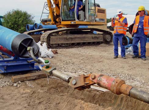 Zum Spülbohren nutzte die Firma Beermann Bohrtechnik GmbH aus Zeitz ein Bohrgerät mit einer Zugkraft von 1.000 kN. Die erste Bohrung mit 200 mm war innerhalb eines Tages abgeschlossen, auf Hindernisse sind die sechs Arbeiter des Steinfurter Unternehmens nicht gestoßen. Im zweiten Gang wurde die Bohrung auf 750 mm und schließlich auf 920 mm aufgeweitet. Durch dieses Bohrloch wurde mit schwerer Technik der Strang aus neuen, je sechs Meter langen Rohren DN 500 eingezogen. Die Einzelrohrmontage der BLS®-Rohre DN 500 wurde von der Baufirma Josef Pfaffinger Leipzig Baugesellschaft mbH durchgeführt. Zur Einführung der Rohre in das Bohrloch unter einem angestrebten Eintrittswinkel von 11° diente eine Montagerampe (Bild 2). Die Baugrube war etwa 15 m lang. Vor dem Einzug wurde die Verbindung der duktilen Gussrohre mit einer Schrumpfmanschette und einem Stahlblechkonus geschützt.