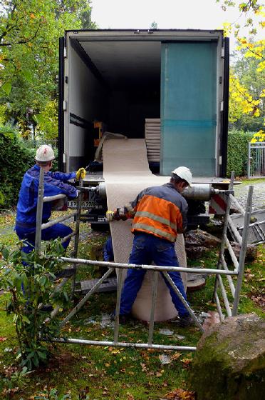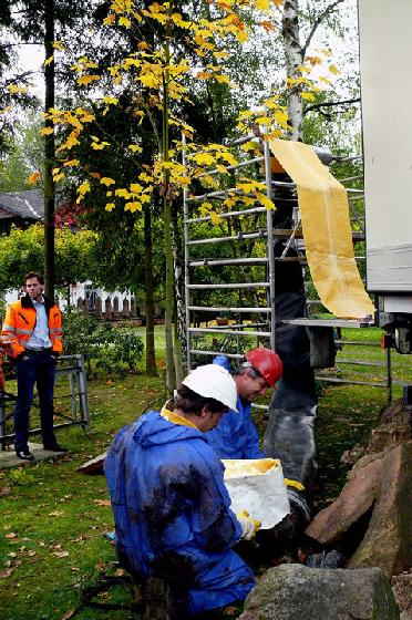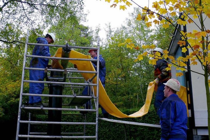 Insgesamt wurde der Schmutzwassersammler Rhein-Straße in drei Inversionen von 100, 110 und 220 Metern Länge saniert. Am 06.10.08 stand die Installation des 110-Meter-Liners im mittleren Streckenabschnitt an. Bei dieser Maßnahme wurde ein schwer zugänglich am Rande eines Teiches liegender Zwischenschacht mit dem Liner „überfahren“. Nachdem Einbau und Aufstellung der Liner per Wassersäule rund sechs Stunden in Anspruch nahmen, wurde das System über den auf dem Startschacht errichteten Inversionsturm an eine mobile Heizanlage angeschlossen. Über Vor- und Rücklauf-Schläuche floss 90°C heißes Wasser 8,0 Stunden lang durch den Liner und härtete die beiden Komponenten gemeinsam zum selbsttragenden System aus.