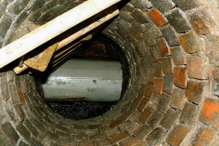 Zu den Altkanälen, die ins neue Netz Eingang fanden, gehört der Schmutzwasser-Sammler Rhein-Straße. Zum öffentlichen Netzbestand gehörend, leitet der Vorkriegs-Steinzeugkanal DN 550 dennoch fast ausschließlich die Abwässer eines großen Lebensmittelbetriebes ab. Die in ihrer Zusammensetzung wechselnde Abwasserfracht hat es in sich: Sie ist chemisch aggressiv und zeitweilig bis zu 80°C heiß. Das zehrt nicht nur am alten Rohr, sondern gab zugleich Sollwerte für das Sanierungskonzept vor, das vom Ingenieurbüro Gringel (Marburg) erarbeitet wurde und auf eine Renovation durch Schlauchlining setzte. Eine Stillegung des Rohrs und ein nachfolgender offener Neubau war nicht nur aus betrieblichen Gründen ausgeschlossen. Eine Erneuerung war in diesem Umfeld auch deshalb wenig ratsam, weil jede Erdbaumaßnahme hier belasteten Aushub zutage fördern könnte.