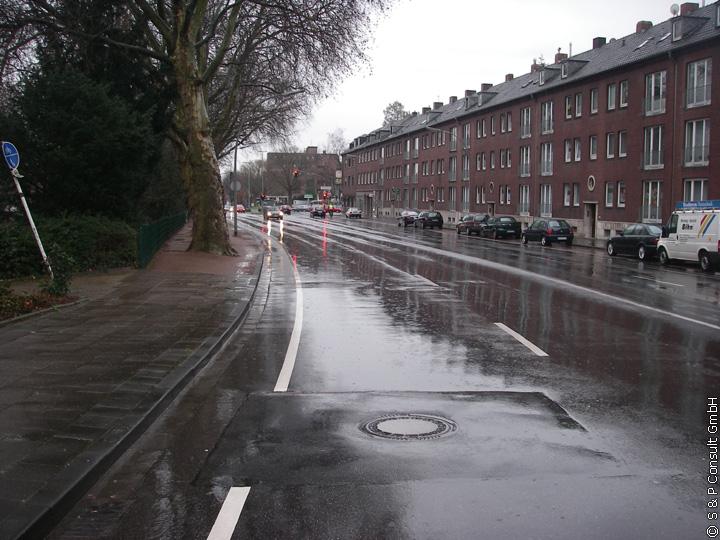 Der betrachtete Sanierungsabschnitt bestand aus vier Haltungen mit einer Gesamtlänge von rd. 166 m, wobei der größte Teil (rd. 126 m) im Straßenraum liegt und durch ein sehr hohes Verkehrsaufkommen gekennzeichnet ist (s. Bild 2 a und b). Der restliche Teil (rd. 40 m) befindet sich unterhalb einer Grünanlage. Der zu sanierende Altkanal weist in der Trasse zwei 90°-Bögen auf. Die Sohltiefen des Kanals liegen gemäß den Kanalbestandsdaten zwischen 3,50 m und 5,00 m unter GOK.