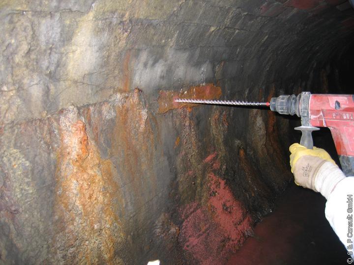 Die innere und äußere Geometrie des Großprofils wurde durch eine Kalibrierung des Abflussquerschnittes und zusätzliche Wanddickenermittlungen festgestellt (s. Bild 4). Zur Ermittlung der Materialkennwerte des Mauerwerkkanals wurden im November 2005 4 Bohrkerne mit einem Durchmesser von 150 mm unter Einsatz eines luftdruckbetriebenen Kernbohrgerätes entnommen. Die Ermittlung der Druckfestigkeit an den entnommenen Bohrkernen erfolgte in Anlehnung an DIN 1048 [1]. Bei den durchgeführten Druckprüfungen wurde als Grundwert der zulässigen Druckspannungen für das Mauerwerk s0 = 4,0 MN/m² ermittelt.