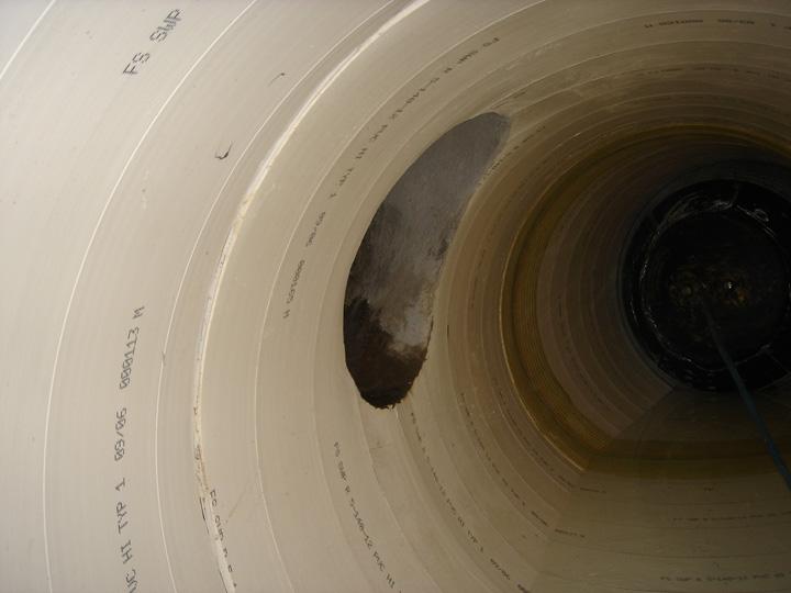 Die Sanierung erfolgte zunächst im Bereich der beiden Kurvenbauwerke mit Wickelrohrsegmenten, welche auf der Baustelle an die Kurvengradiente angepasst wurden (s. Bild 8 oben). Die Stoßfugen zwischen den einzelnen Segmenten (bis zu 2 cm breit) wurden mit einem Handlaminat, bestehend aus einem harzgetränkten ECR-Glasgewebe (s. Bild 8 unten), abgedichtet, um einen Dämmeraustritt bei der Verdämmung des Ringraumes zu verhindern. Diese Arbeiten erfolgten aus einer Baugrube für einen zusätzlich geplanten Betriebsschacht (s. Bild 9).