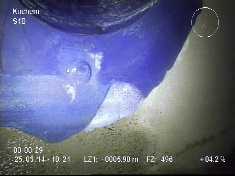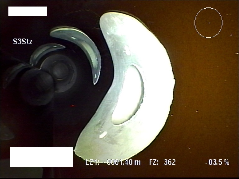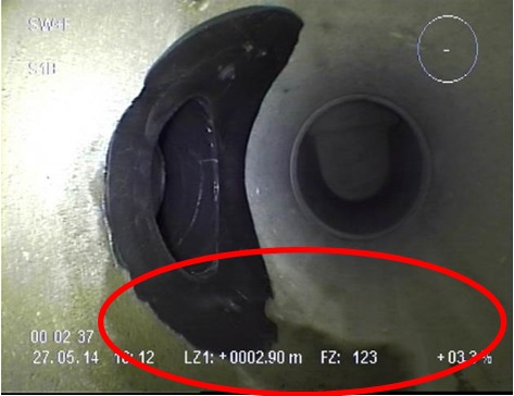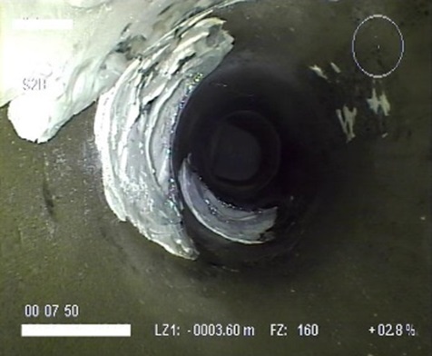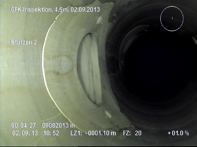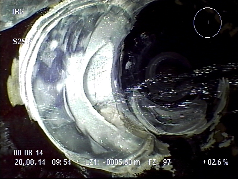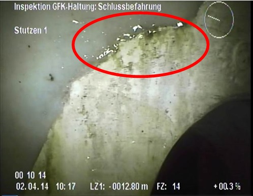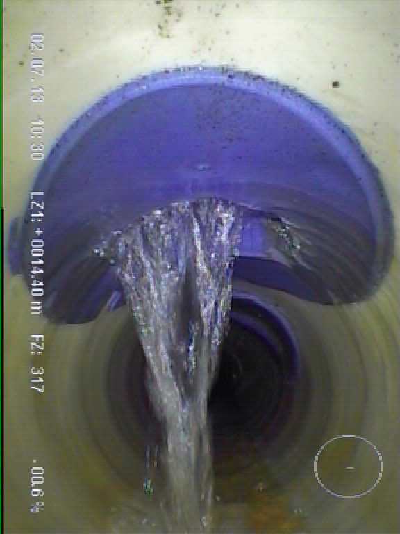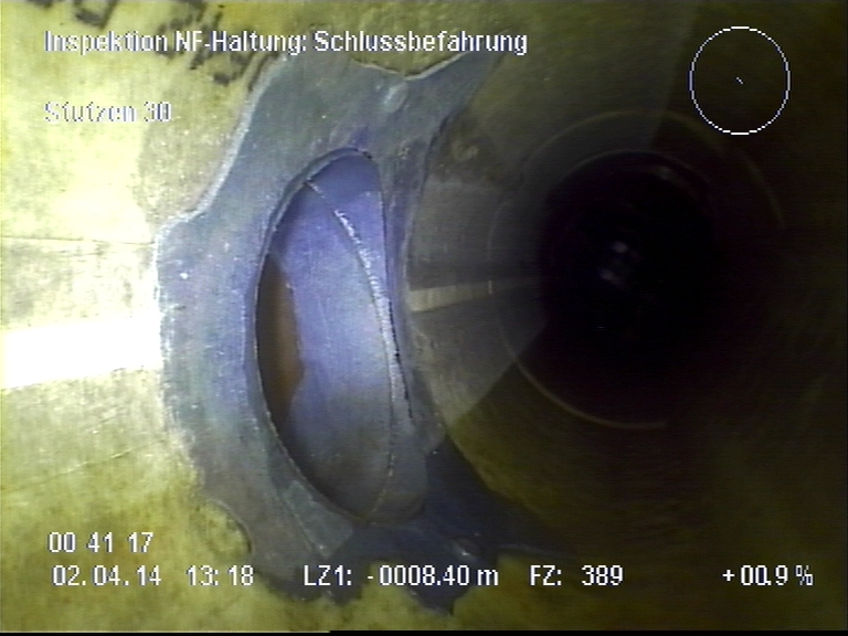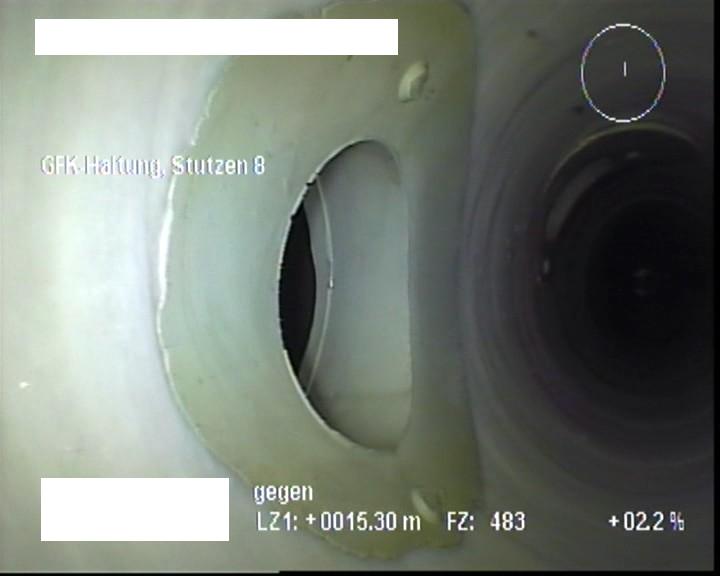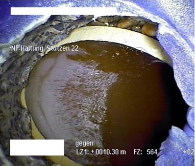 Nach Abschluss der Kanalreinigungsarbeiten fanden sich im nicht-sanierten Hauptkanal (Stutzen-Reparatur) keine Veränderungen. Am Liner-sanierten Hauptkanal (Stutzen-Einbindung) konnten zwar vielfach Materialabplatzungen festgestellt werden, diese hatten allerdings keinen besonderen Einfluss auf Dichtheit und Funktionsfähigkeit der sanierten Stutzen.