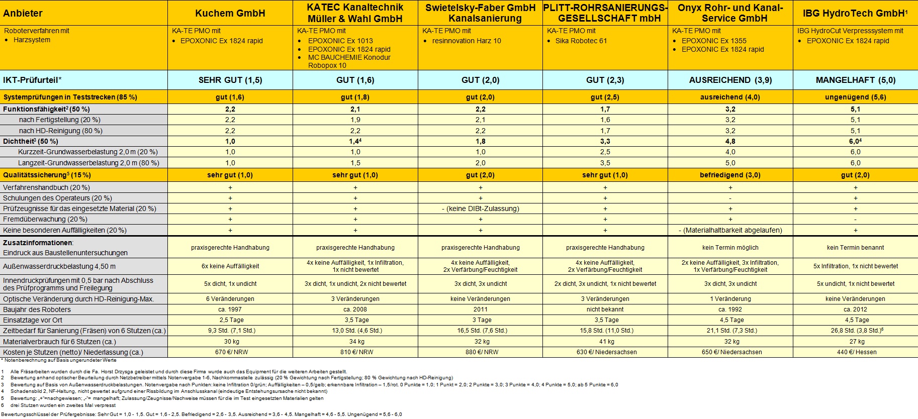 Das beste Ergebnis hat bei der "Stutzen-Einbindung im Liner-sanierten Hauptkanal" die Kuchem GmbH mit der Note SEHR GUT erzielt. Es folgen mit der Note GUT die Firmen KATEC Kanaltechnik Müller & Wahl GmbH, Swietelsky-Faber GmbH Kanalsanierung und PLITT-ROHRSANIERUNGS-GESELLSCHAFT mbH. Ein ausreichend erreicht die Onyx Rohr- und Kanal-Service GmbH. Die IBG HydroTech GmbH weist mit ihrem relativ neu entwickelten Robotersystem noch deutlichen Optimierungsbedarf auf und schafft nur ein MANGELHAFT.