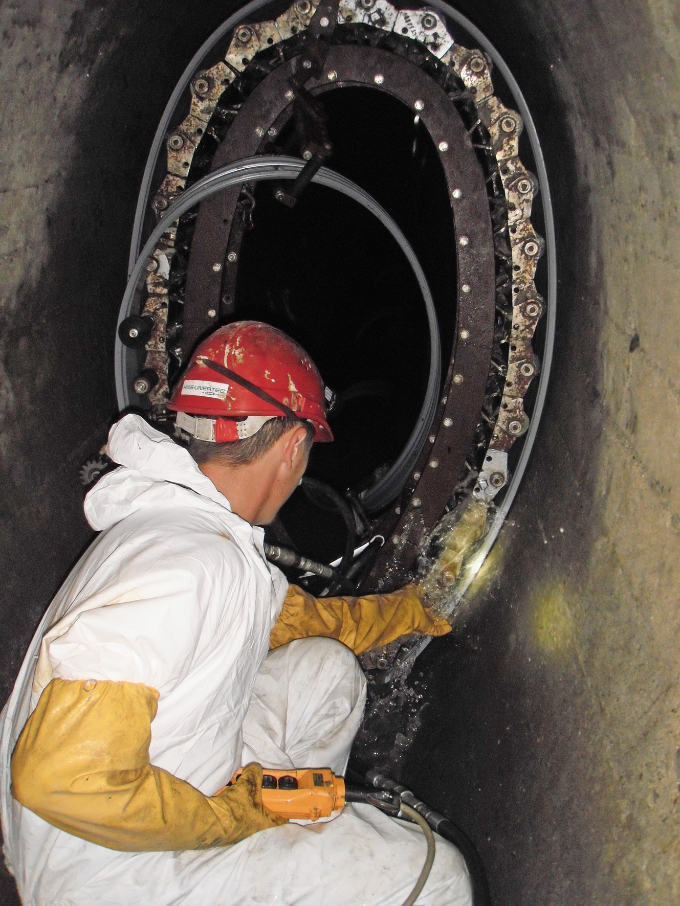 Für die Ringraumverfüllung wurde nach der Fertigstellung des Liners die Aussteifung installiert. Die Stütz-Einheiten positionierten das Wickelrohr gemäß den statischen Anforderungen und beugten somit einem Auftrieb, einer Lageabweichung und Deformation bei der anschließenden Verfüllung vor. Der Ringraum wurde jeweils nach rund 80 m Installationslänge abgemauert und lagenweise mit dem speziellen Mörtel verfüllt, um die statische Eigenschaft abschnittsweise wieder herzustellen.