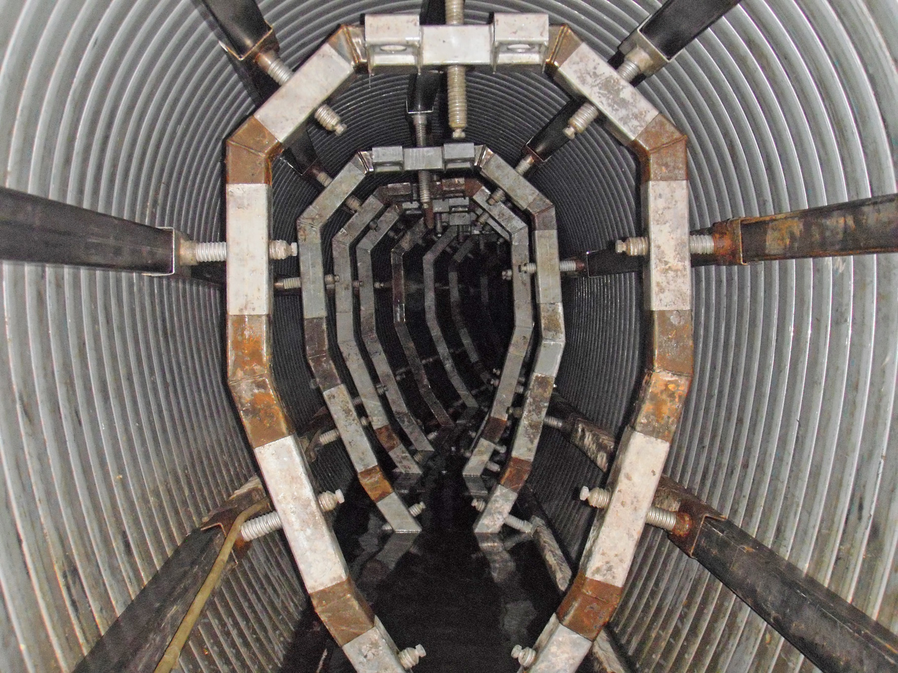 Der Wickelvorgang belässt ganz gezielt einen definierten Ringraum zwischen Wickelrohr und Altrohr, der im nachfolgenden Arbeitsgang mit einem Hochleistungsmörtel verfüllt wurde. Die Stärke des Ringraumes wird nach der Devise bemessen, dass so wenig Ringraum wie möglich, aber so viel Ringraum wie statisch nötig festgesetzt wird. In diesem Fall betrug die Stärke zwischen 50 mm und 80 mm.
