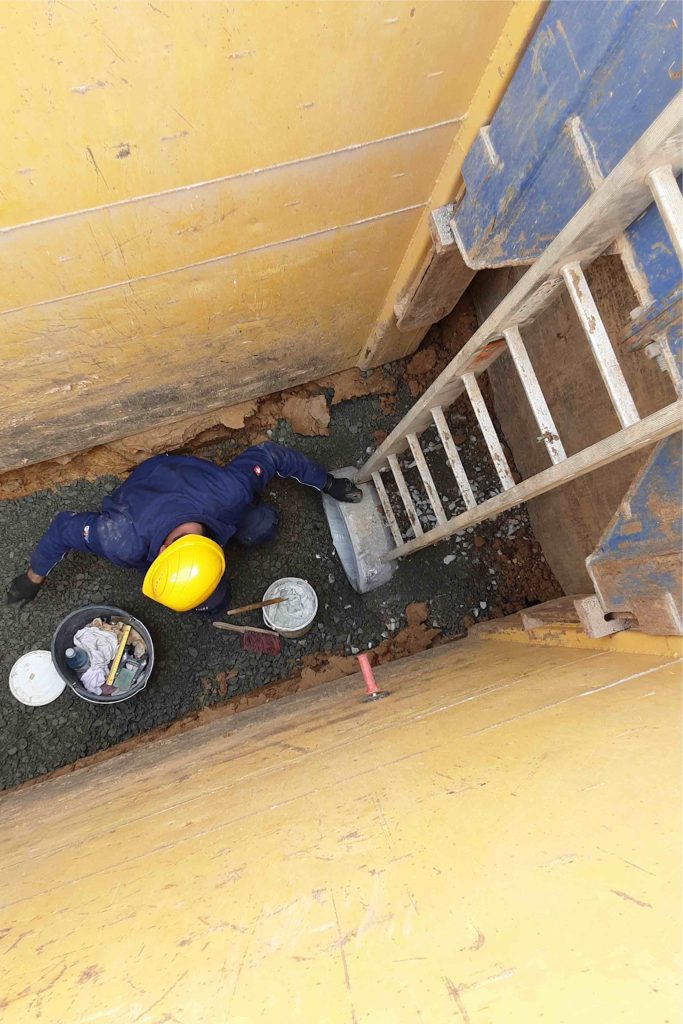 Einen doppelten Pluspunkt bietet das Rohr-in-Rohr-Prinzip auch mit Blick auf die Dichtung. FABEKUN®-Rohre verfügen mit einer innen gekammerten Vakuumdichtung zur Verbindung der Kunststoffrohre und einer äußeren Lippendichtung im Betonrohr über zwei unabhängig voneinander bestehende Dichtsysteme. „Das ist optimal für ein zusätzliches Plus an Sicherheit“, kann Göbel aus Erfahrung berichten. Neben den Kanalrohren kommen auf der 2.800 m langen Strecke auch 35 Schächte zum Einsatz.