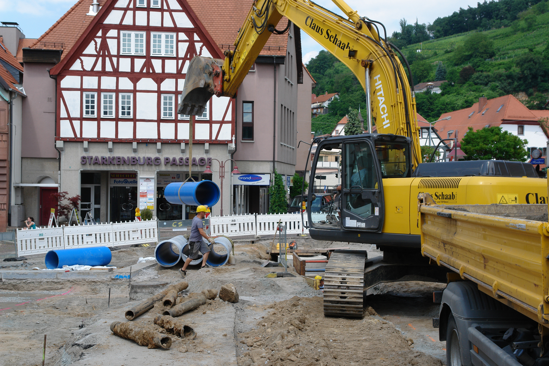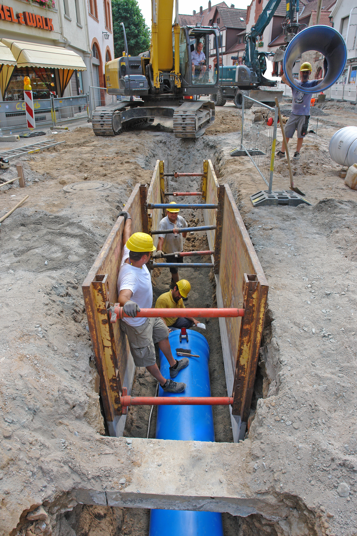 Besonders auf der Baustelle im Graben war den Tiefbauern jede Erleichterung bei der Arbeit willkommen, denn die örtlichen Rahmenbedingungen stellten selbst die Experten vor eine Herausforderung. Schaab: "In puncto Tiefbau war das ein regelrechter Abenteuerspielplatz. Wir mussten auf denkmalgeschützte Gebäude mit empfindlichen Fundamenten Rücksicht nehmen. Hinzu kamen viele querende Leitungen und zahlreiche Fehlanschlüsse." Auch der Baugrund war in schlechtem Zustand. Um die sensible Bausubstanz der Häuser im Baufeld nicht zu gefährden, mussten die Tiefbauer die Baugrube mit Flüssigboden verfüllen, da ein Verdichten auf herkömmliche Weise zu starke Erschütterungen bedeutet hätte. Noch vor Beginn der Kanalbaumaßnahme hatten Experten zur Sicherheit den Ist-Zustand der Häuser dokumentiert und dort Messgeräte installiert.