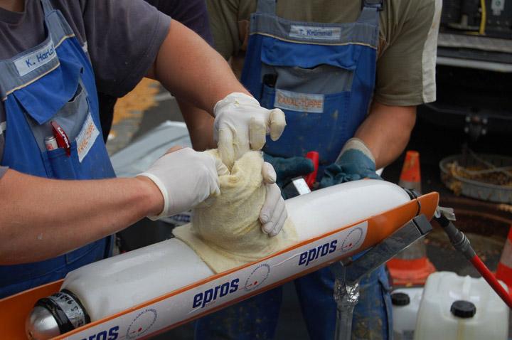 Zunächst wurde die Glasfaser-Hutmanschette mit dem epros Kurzlinerharz getränkt und dann auf den mit Trennmittel eingestrichenen Packer-Finger gestülpt, so dass die Hütchenkrempe fest auf dem Packer-Korpus lag. Im Gegensatz zu den bekannten Packern verfügt der eprosLCR-B-Packer über einen seitlichen Finger, der sich später in den Zulauf hineinstülpt. Zum Einführen über das Hauptrohr muss dieser natürlich "eingefahren" werden. Dies geschieht mittels einer speziell entwickelten Reversionstechnik, wobei das Glasfaser-"Hütchen" bis zur Krempe invers mit eingestülpt wird. Ein dünner Bindedraht fixiert den eingestülpten Finger für den Transport. Er löst sich später, sobald Druck auf den Packer gegeben wird.
