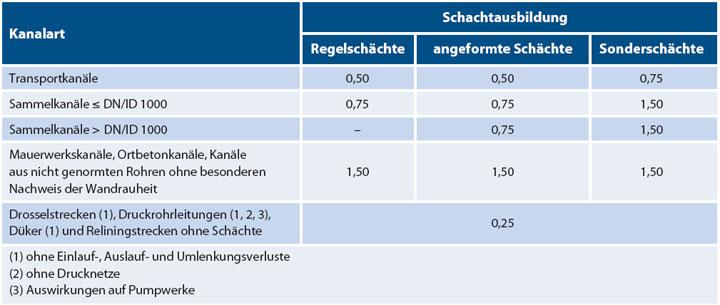 Für die hydraulische Dimensionierung neu zu errichtender Kanalisationen empfiehlt das ATV-DVWK-Arbeitsblatt A 110 die Anwendung des so genannten Pauschalkonzepts. Es basiert auf der vereinfachten Vorgehensweise, bei der sowohl diskontinuierlich anfallende Strömungswiderstände oder -verluste als auch rohrwerkstoffspezifische Widerstände zu einem pauschalen Rauheitsmaß, der so genannten betrieblichen Rauheit kb, zusammengefasst werden. Diskontinuierlich anfallende Strömungswiderstände oder -verluste können dabei z. B. innerhalb einer Haltung auftretende lokale Strömungswiderstände oder Energiehöhenverluste sein. Ein möglicher rohrwerkstoffspezifischer Widerstand ist die natürliche Wandrauheit k. Einen Überblick über Pauschalwerte für die betriebliche Rauheit in Abhängigkeit von Kanalart und Schachtausbildung gibt Tabelle 1.
