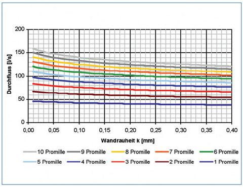 exemplarisch die Durchflussraten eines Rohres DN/ID 400 in Abhängigkeit der Wandrauheit k (0,01 mm ≤ k ≤ 0,4 mm) für verschiedene Sohlgefälle (1 bis 10 Promille) vorgestellt (andere auftretende, werkstoffunabhängige Einzelverluste, resultierend z. B. aus Lageungenauigkeiten, Rohrverbindungen, Schachtbauwerken, Zuläufen, Krümmungen etc. bleiben unberücksichtigt). Dabei wurde von folgenden Randbedingungen ausgegangen: