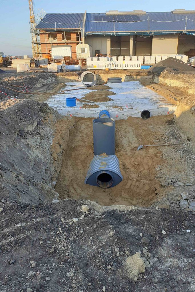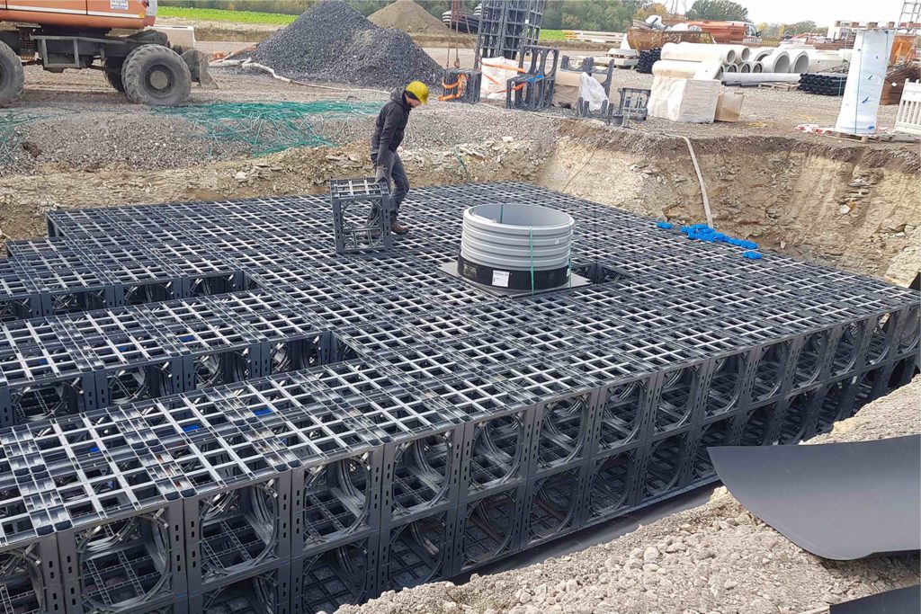 Vor diesem Hintergrund wurde ein Konzept erarbeitet, bei dem das auf dem neuen Betriebsgelände anfallende Regenwasser über HS®– und Connex Kanalrohre DN/OD 160 bis DN/OD 400 in eine Sedimentationsanlage gelangt, die einer Retentionsanlage aus D-Raintank 3000®-Elementen vorgelagert ist. Über eine Wirbeldrossel wird das dort zwischengespeicherte Regenwasser gedrosselt an den öffentlichen Regenwasserkanal abgegeben. „Damit haben wir alle nötigen Auflagen erfüllt“, so Nüßing weiter, „zudem wurde im Gegensatz zur Anlage einer offenen Sedimentationsmulde deutlich Platz eingespart, der auf dem von Baufahrzeugen befahrenen und zur Lagerung von Baustoffen genutzten Gelände einfach nicht zur Verfügung stand.“