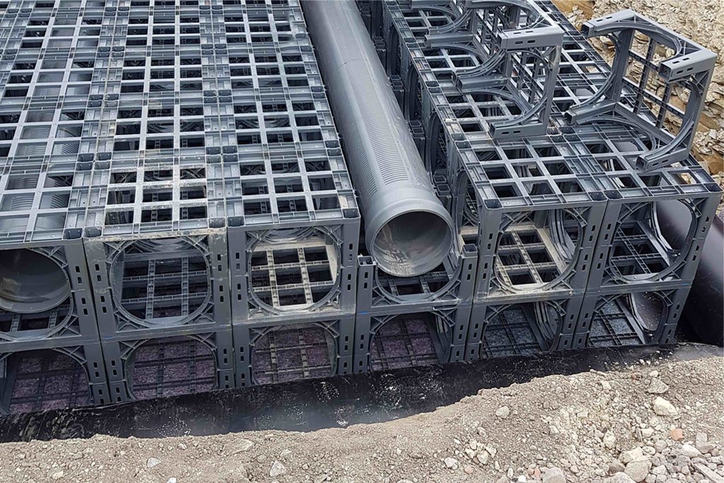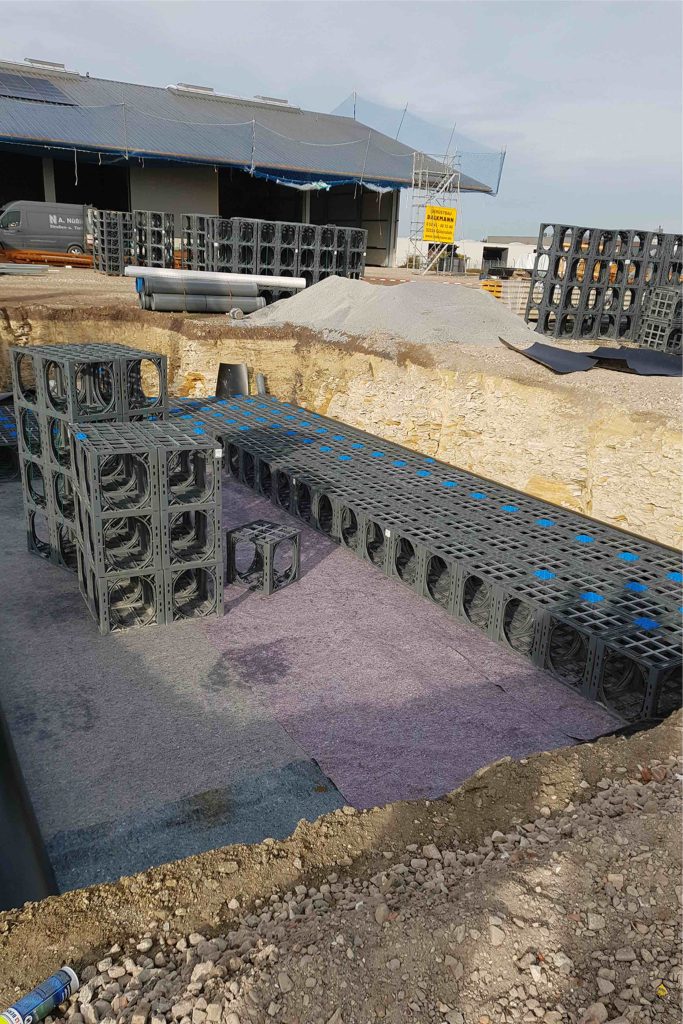 Laut Horstmann handelt es sich um ein System für den ökologisch sinnvollen Umgang mit Regenwasser, das nach dem fachgerechten Einbau Niederschlagswasser speichern und sukzessive dreidimensional an das umliegende Erdreich abgeben kann. Das wartungsarme System eignet sich zur Dach-, Hof-, Abstellflächen- und Straßenentwässerung, zur Entwässerung von Gewerbeflächen aber auch für die Kombination mit einer Mulde oder einem Filterschacht. Mit Vlies, Kunststoffdichtungsbahn (KDB) und Vlies mehrlagig ummantelt können die D-Raintank 3000®-Elemente allerdings auch als Speicherrigole oder Zwischenspeicher genutzt werden – so wie in Drensteinfurt.