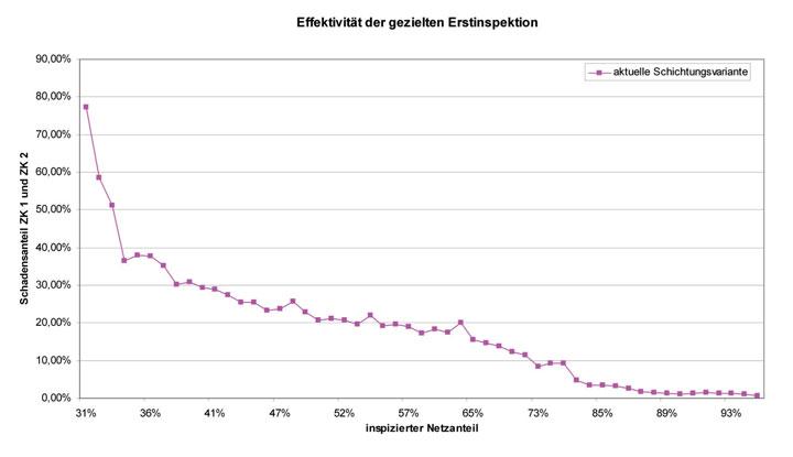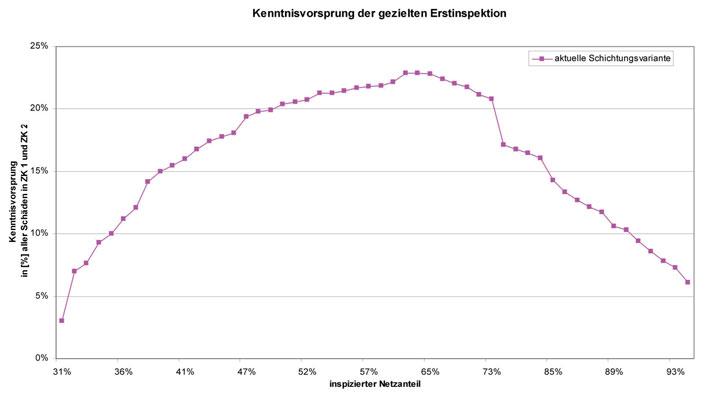Bei der gezielten Erstinspektion auf Basis der selektiven Kanalinspektion werden im Wesentlichen zunächst die Schichten untersucht, die einen möglichst hohen Anteil an stark schadhaften Haltungen aufweisen. Hieraus ergeben sich bei gleichem Inspektionsumfang zu Beginn deutlich höhere “Trefferquoten”, d.h. eine größere Effektivität, als bei einer konventionellen, flächendeckenden Inspektion.