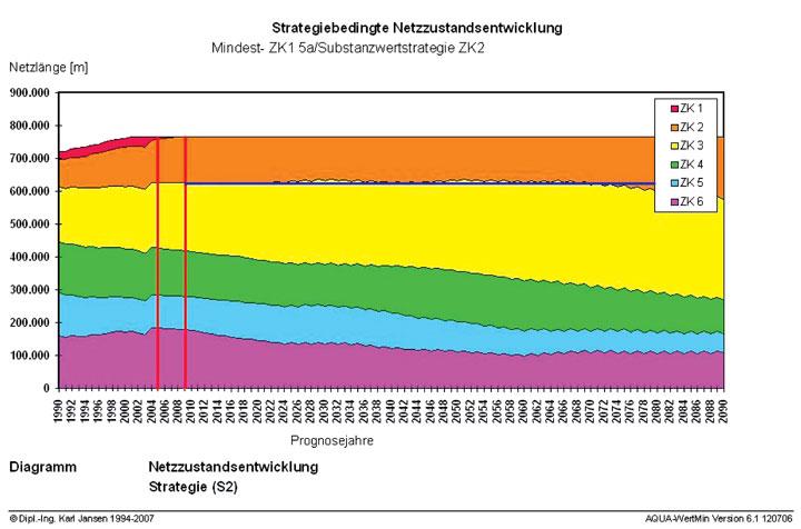 Hierzu sollte unter Verwendung der vorhandenen Stammdaten des Netzinformationssystems und der aus der bisherigen Eigenüberwachung bekannten Netzzustände von rd. 523 km eine Hochrechnung auf das Gesamtnetz von rd. 1.629 km unter Einbeziehung der nicht inspizierten Kanäle mit dem statistischen Prognosemodell AQUA-Selekt Version 3.0b, jetzt 4.0, [1] vorgenommen, eine Prognose und Kalibrierung der Netzalterung mit dem Alterungsprognosemodell AQUA-WertMin 6.1 [2] durchgeführt, Wiederbeschaffungswert und Abnutzungsvorrat (Substanzwert) der Kanalisation bestimmt und mögliche Sanierungsszenarien untersucht werden.