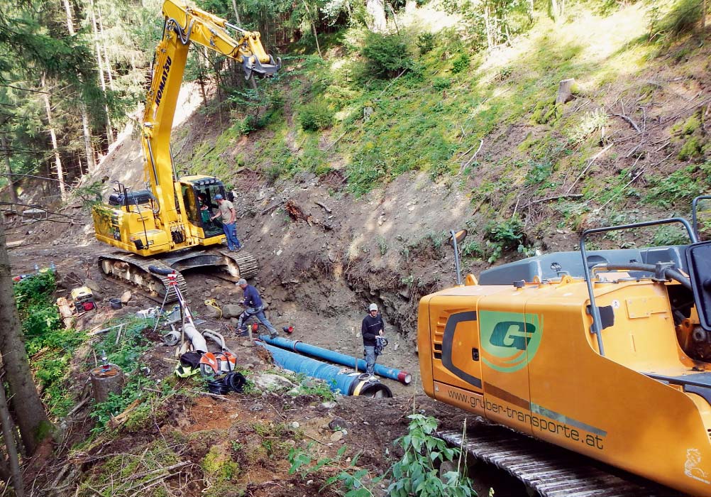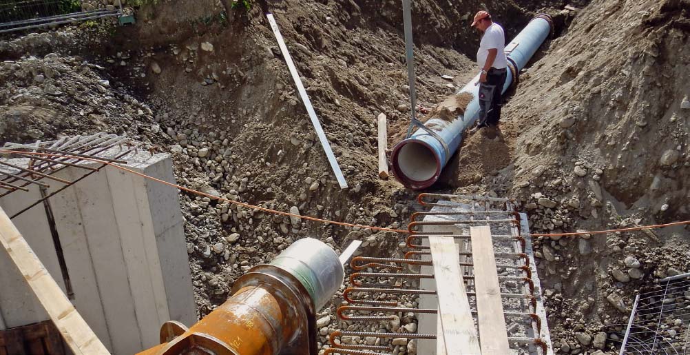 Ein nicht unwesentlicher Synergieeffekt wurde im Zuge des Rohreinbaus zugunsten der Gemeinde genutzt. Von einem Hochbehälter aus führte eine ältere, drucklose Leitung zu den Trinkwasserquellen auf der Flaurlinger Alm, welche die TIWAG ohnehin hätte ersetzen müssen. Aus diesem Grund wurde eine kleine Druckrohrleitung DN 200 – ebenfalls aus duktilem Gusseisen – im Rohrgraben mit eingebaut (Bild 10), wodurch die Gemeinde Flaurling die Option auf ein Trinkwasserkraftwerk bekommt, das heute bereits in Umsetzung ist.