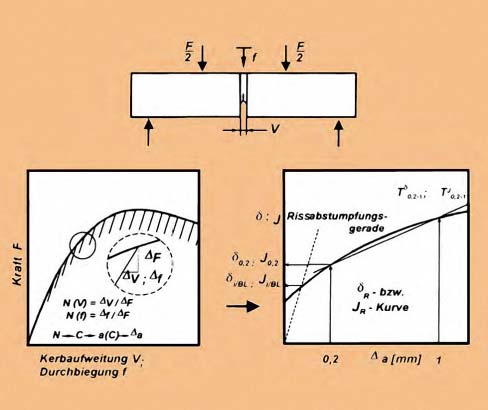 Bei Belastung dieser Probe im 4-Punkt-Biegeversuch (Bild 4, oben) wird die Kerbaufweitung bzw. die Durchbiegung bestimmt (Bild 4, unten links). Aus diesen Ergebnissen wird die für die Rissaufweitung Δa erforderliche physikalische Arbeit J berechnet (Bild 4, unten rechts). Der in diesen Untersuchungen interesante J0,2 - Wert kann dann bei Δa = 0,2 mm abgelesen werden.