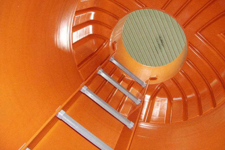 Ein zusätzlicher Sicherheitsaspekt sind die Steigstufen im Schacht, die bislang in jedem dritten Schacht schadhaft sind. Obwohl Schächte in der Regel nur selten begangen werden und moderne Werkstoffe Wartungsarbeiten in noch größeren Intervallen erlauben, ist die Dauerhaftigkeit von Steigleitern dennoch für Netzbetreiber ein wichtiger Aspekt. Zudem wurden die Anforderungen an Steiggänge in der überarbeiteten BGR 177 nochmals verschärft. Zweiläufige Steigeisen aus Guss werden nicht nur vom Personal ungern gesehen, sondern auch von der Richtlinie. Für dauerhafte Sicherheit haben sich die Entwickler des AWASCHACHTs daher für rutschfeste Steigstufen aus polymeren Werkstoffen entschieden. Diese sind in zwei in der Schachtwand integrierten Stegen eingebaut.