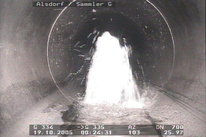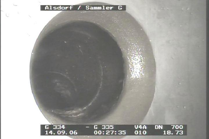 Auf einer Länge von etwa 10 Kilometern weist dieser etwa 20 Jahre alte Sammler ein außergewöhnliches Schadensbild auf: Insbesondere bei den Asbestzementrohren hat sich eine im Durchschnitt etwa 2 cm tiefe und 1,5 cm breite Rille gebildet, die sich wie eingefräst durch die Sohle zieht. "Die Ursache für diesen Schaden ist, trotz umfangreicher Nachforschungen und wissenschaftlicher Untersuchungen, ein bis heute ungeklärtes Phänomen und wird wohl ewig ein Geheimnis bleiben," erläutert Jürgen Neitzert vom Abwasserzweckverband. Vermutet wird die Einleitung eines hoch aggressiven Mediums, Zusammensetzung und Herkunft lassen sich jedoch nicht mehr ermitteln.
