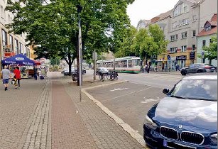 Die 2 bis 4-spurige Halberstädter Straße mit ihrem breiten Gehbereich, Radweg, Parkstreifen, Baumbestand, Straßenbahn und Busverkehr vor Beginn der Sanierungsarbeiten. [Quelle: EADIPS®]