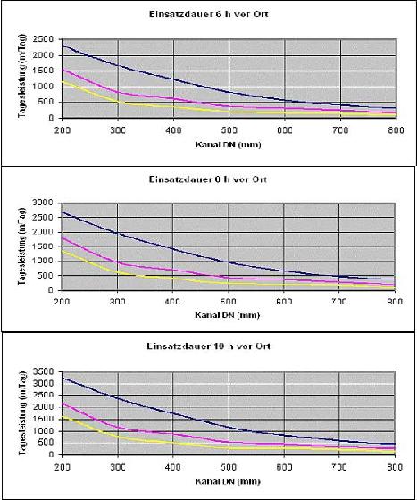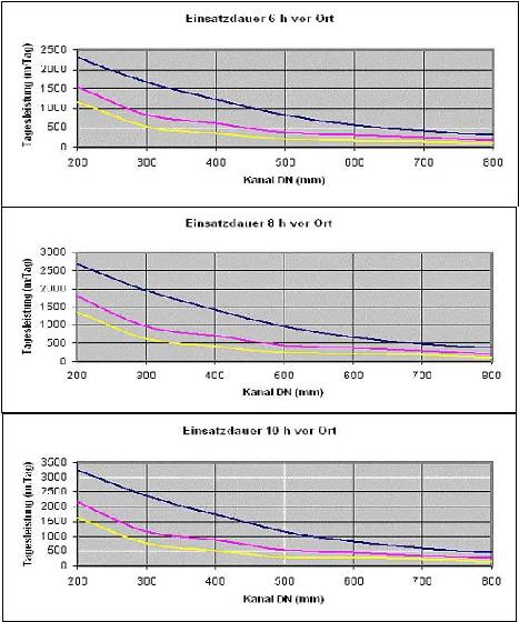Da die von der DWA und vom VDRK angenommenen Tagesleistungen ab DN 500 offensichtlich zu hoch sind, haben diese bei größeren Nennweiten zu geringe Leistungskosten (€/m) zur Folge. Der „Runde Tisch“ beim IKT hält offenbar einen Meterpreis von ca. 1,- €/m bei einer Tagesleistung von ca. 1000 m/Tag für angemessen, ohne jedoch dabei die Rohrnennweite und den Verschmutzungsgrad zu nennen. Leider werden diese Parameter bei Leistungsangaben allzu oft vergessen.
