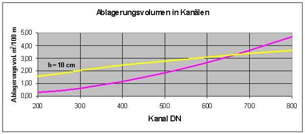 Grundsätzlich soll sich der Volumenstrom (l/min) einer HD-Pumpe in einem ausreichenden Verhältnis zum zu spülenden Kanaldurchmesser befinden, damit die Transportleistung des Spülwassers zum Ablagerungsvolumen im Kanal (Kreissegment * 100 m) passt. Das Ablagerungsvolumen (m