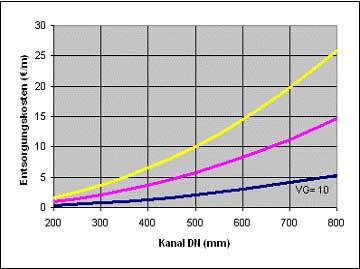 3 und angenommenen Entsorgungskosten in Höhe von 120,- €/t errechnen sich für die Durchmesser DN 200 bis DN 800 folgende Entsorgungskosten, wenn man diese auf einen Meter (€/m) Kanal beziehen würde: