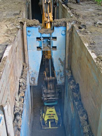 Neben der Verfüllung der Baugrube mit einem vor Ort aufbereiteten Aushubboden und der Rohrverlegung mit einem ferngesteuerten Verlegegerät zählte das Linearverbausystem von E+S dazu. Im Vorfeld des Pilotprojekts haben die Hückelhovener Verbauprofis das leistungsstarke Verbausystem mit weiteren technischen Leckerbissen ausgestattet: Über ein System von so genannten Injektionsrohren können Baugruben ohne Arbeitsraum beim Ziehen des Verbaus verfüllt werden. Darüber hinaus sorgt eine modifiziere Laufwagenkonzeption für ein reibungsloses Handling und größtmögliche Flexibilität beim Ein- und Rückbau der Verbaumodule sowie beim Verlegen der Rohre.
