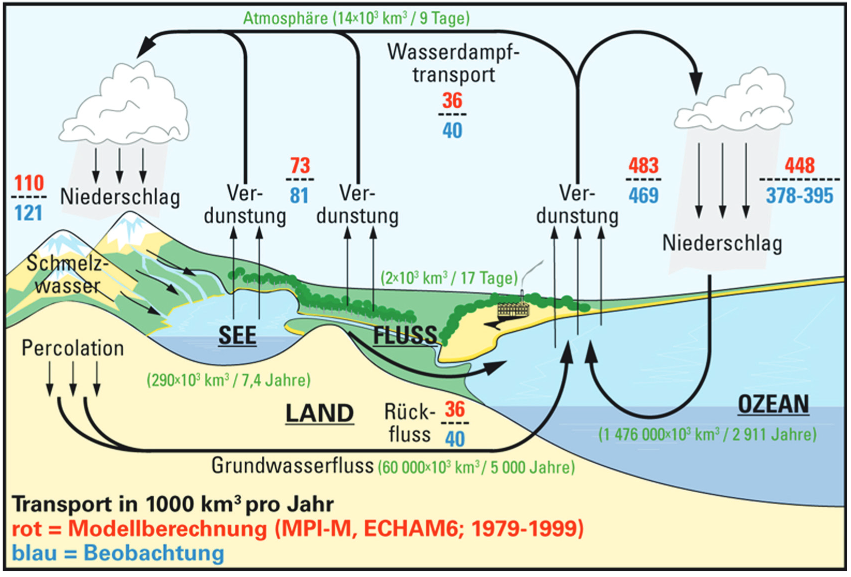 Wasser verteilt sich sowohl in der Erdatmosphäre als auch auf dem Festland. Angetrieben durch die Energie der Sonne bildet der Transport von Wasser den für alle Lebewesen wichtigen Wasserkreislauf. (Ginzky 2005)
