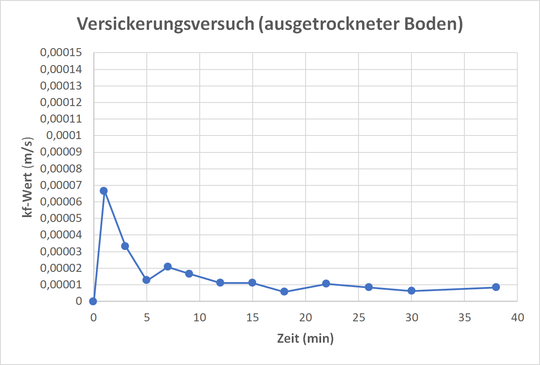 Bei dem trockenen Boden lag die Anfangsleitfähigkei bei 7,0E-5 m/s und sank bereits nach 5 Minuten auf 1,0E-5 m/s ab (Abb. 10a).