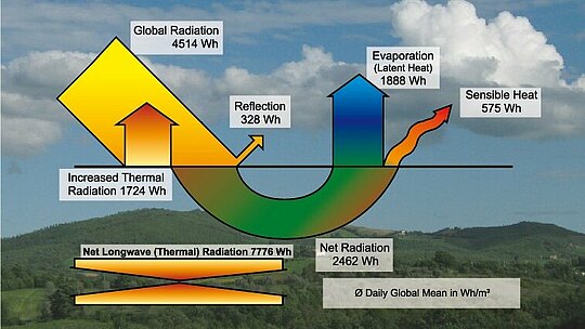 Dieser globale Wasserkreislauf ist in Abbildung 1 dargestellt. Er beinhaltet die Verdunstung von Wasser über den Ozeanen, welches daraufhin in Form von Niederschlag auf das Festland fällt. Dieses Niederschlagswasser kann anschließend ins Grundwasser versickern, in die Atmosphäre verdunsten oder in die Ozeane zurückfließen. Aufgrund zunehmender Urbanisierung und zunehmenden Versiegelung von 800 km² jährlich, wird dieser natürliche Kreislauf unterbrochen und kann somit zur Verstärkung von globalen Klimaveränderungen beitragen. Bei der Verdunstung von Wasser über die natürliche Begrünung beispielsweise, wird mit 1.888 Wh/m² und Tag die Umgebung gekühlt. (Abbildung 2).
