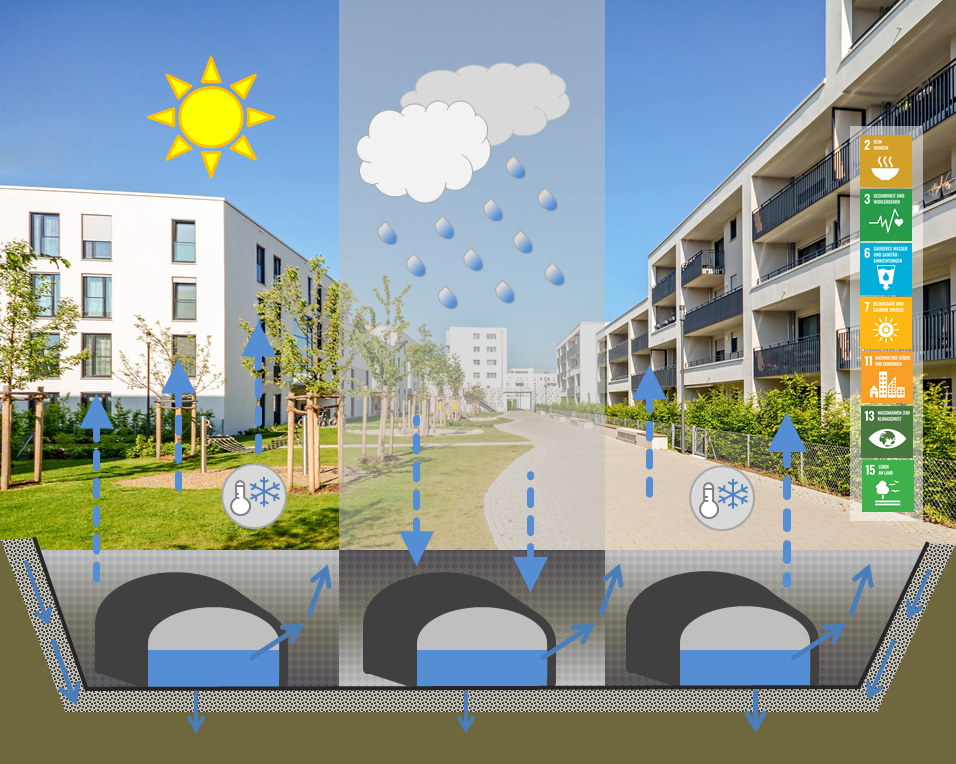 Abbildung 5: Die neue kapillare Unterflur Regenwassermanagement-Lösung: speichert, kühlt, reinigt und bewässert gleichzeitig. [Quelle: INTEWA]