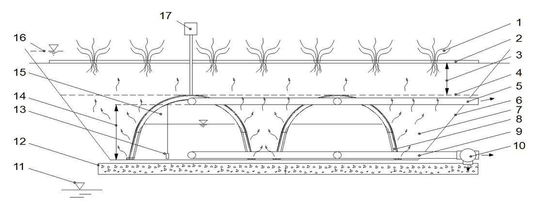 Neben der Wasserauffüllung ist eine Zugabe von Nährstoffen möglich. An der Oberfläche über dem System richtet sich die Art der Bepflanzung (1) nach der Aufbauhöhe des Systems sowie der Bodenart, den Umgebungsbedingungen und der Benutzung landwirtschaftlicher Maschinen bzw. der Bodenbelastbarkeit. Alternativ zur Bewässerung von Pflanzen kann auch nur eine Verdunstung über kapillare Deckschichten erfolgen. Prinzipiell sind für das betrachtete System alle Pflanzen bis zu einer Wurzeltiefe von 1,5m geeignet. Unterhalb der Folienwanne (6) befindet sich eine zusätzliche Drainageschicht (12). Diese hat die Aufgabe das Überlaufwasser aus dem Retentionsbecken (16) außerhalb des Systems gleichmäßig in die darunter liegende Bodenfläche zu verteilen.