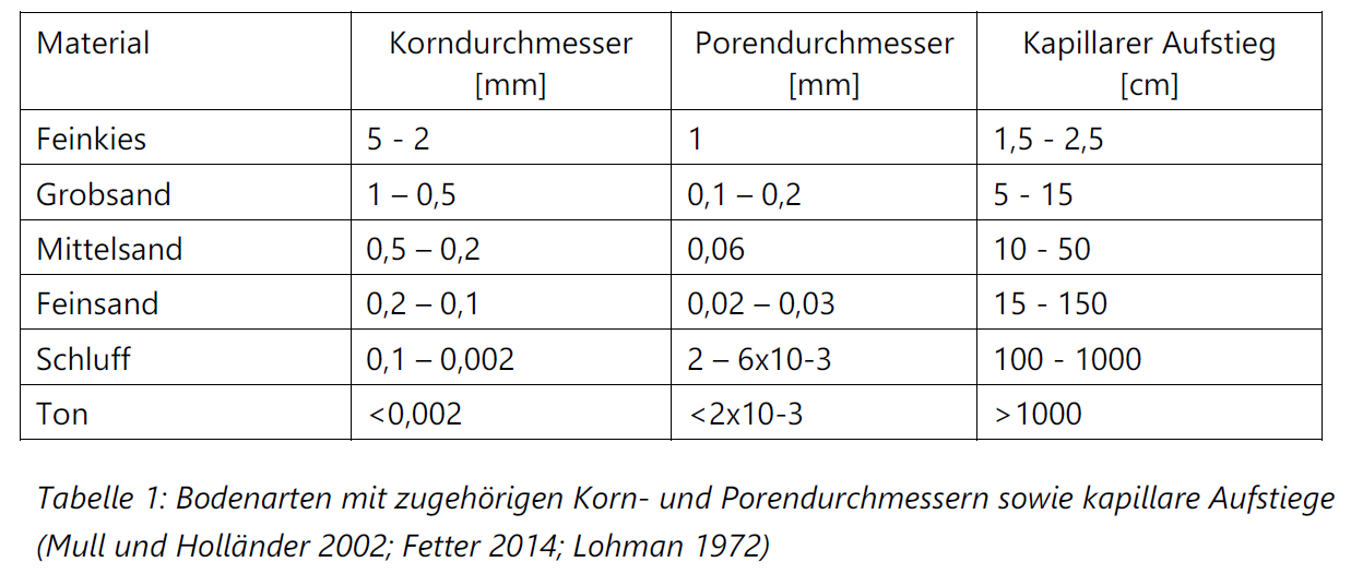In der Tabelle 1 sind für verschiedene Bodenarten die Korn- und Porendurchmesser sowie die dazu korrespondierenden kapillaren Aufstiege dargestellt. Demnach werden in Feinsand, Schluff und Ton die höchsten kapillaren Aufstiege erreicht.
